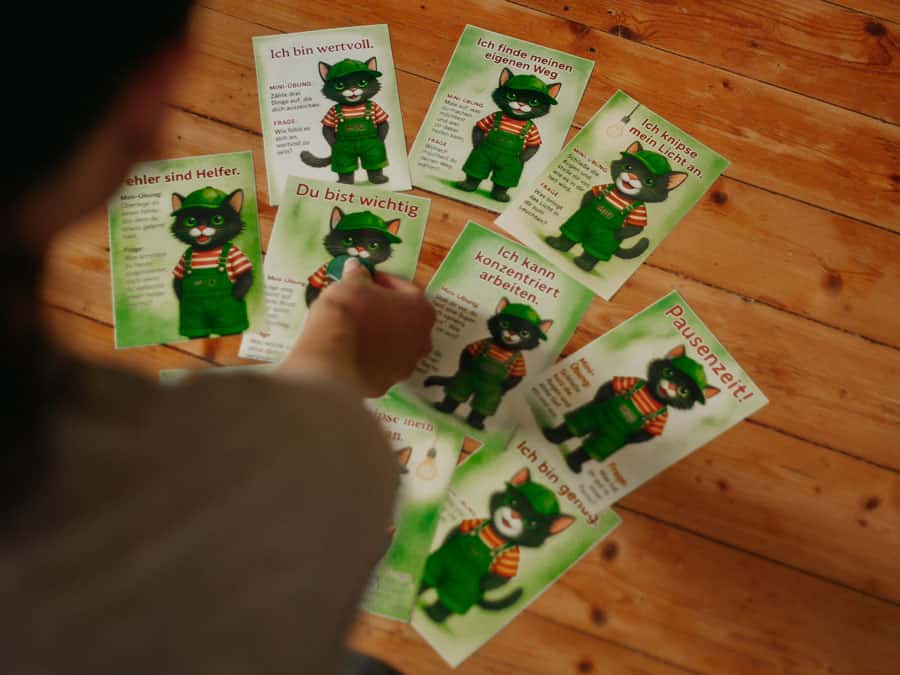 Kater Mio – unser Lernbegleiter mit Samtpfoten. Er erinnert und alle daran, dass Pausen erlaubt sind, Fehler dazugehören und Kuscheleinheiten manchmal Wunder bewirken.